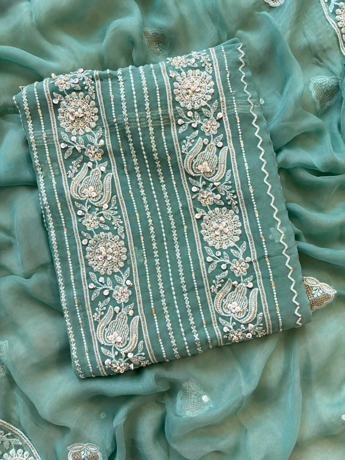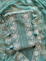 This elegant aqua green georgette chikankari suit is a perfect blend of timeless embroidery and modern embellishments. The intricate hand chikankari work is beautifully highlighted with sequins, pearls, stones, and zari thread embroidery, giving the outfit a regal touch. Paired with a matching embroidered dupatta, this suit is ideal for weddings, festive occasions, and traditional celebrations. The soft georgette base makes it comfortable while maintaining a graceful fall, making it a must-have for your ethnic wardrobe.