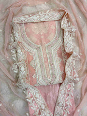 This baby pink unstitched suit set is a timeless expression of elegance and craftsmanship. Designed for weddings and grand festive occasions, the suit features intricate all-over chikankari embroidery enhanced with refined panel design elements. The neckline is heavily adorned with matching moti and beadwork, adding depth, richness, and a luxurious finish to the ensemble. Paired with a delicately embroidered chiffon dupatta, this suit is ideal for those who appreciate understated opulence.