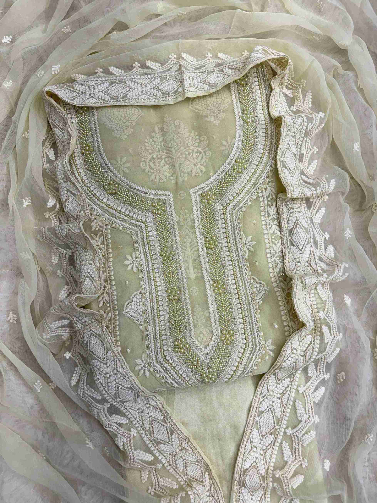 Heavy moti and bead embellishment on the neckline in matching base color