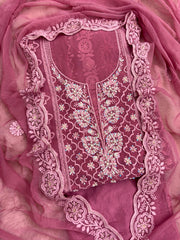 This elegant unstitched suit set is crafted in a plum tone, showcasing timeless chikankari artistry. The georgette shirt features all-over chikankari embroidery, enhanced with a beautifully embellished neckline detailed with moti, beads, and sequence for a refined and festive appeal.