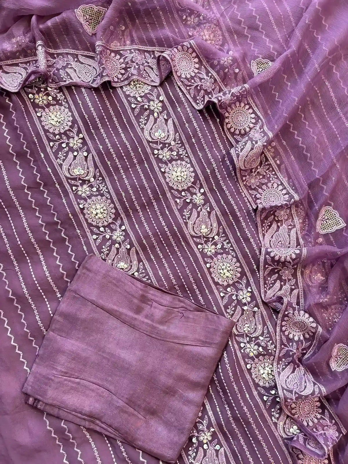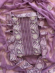 This elegant purple georgette chikankari suit is a perfect blend of timeless embroidery and modern embellishments. The intricate hand chikankari work is beautifully highlighted with sequins, pearls, stones, and zari thread embroidery, giving the outfit a regal touch. Paired with a matching embroidered dupatta, this suit is ideal for weddings, festive occasions, and traditional celebrations. The soft georgette base makes it comfortable while maintaining a graceful fall, making it a must-have for your ethnic wardrobe.