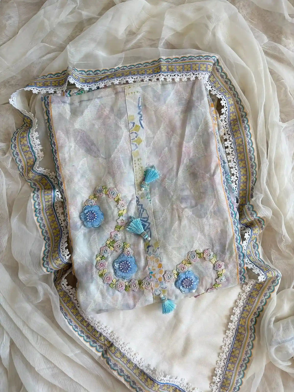 Radiate freshness and elegance in this ivory cotton unstitched suit, adorned with vibrant blue floral embroidery enhanced with delicate bead and sequin highlights. The kurta is detailed with pastel accents, tassel embellishments, and lace-edged borders that add a feminine charm. Paired with a soft chiffon dupatta, featuring intricate printed patterns and lace trimming, this ensemble is perfect for summer festivities, casual get-togethers, and daytime celebrations. Lightweight and graceful, it beautifully balances comfort with festive style.