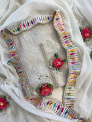 Elevate your ethnic wardrobe with this elegant ivory jute cotton suit, beautifully crafted with delicate embroidery and highlighted by 3D floral embellishments for a modern touch. The suit is paired with an airy embroidered dupatta, bordered with multicolored threadwork, adding a vibrant yet classy appeal.