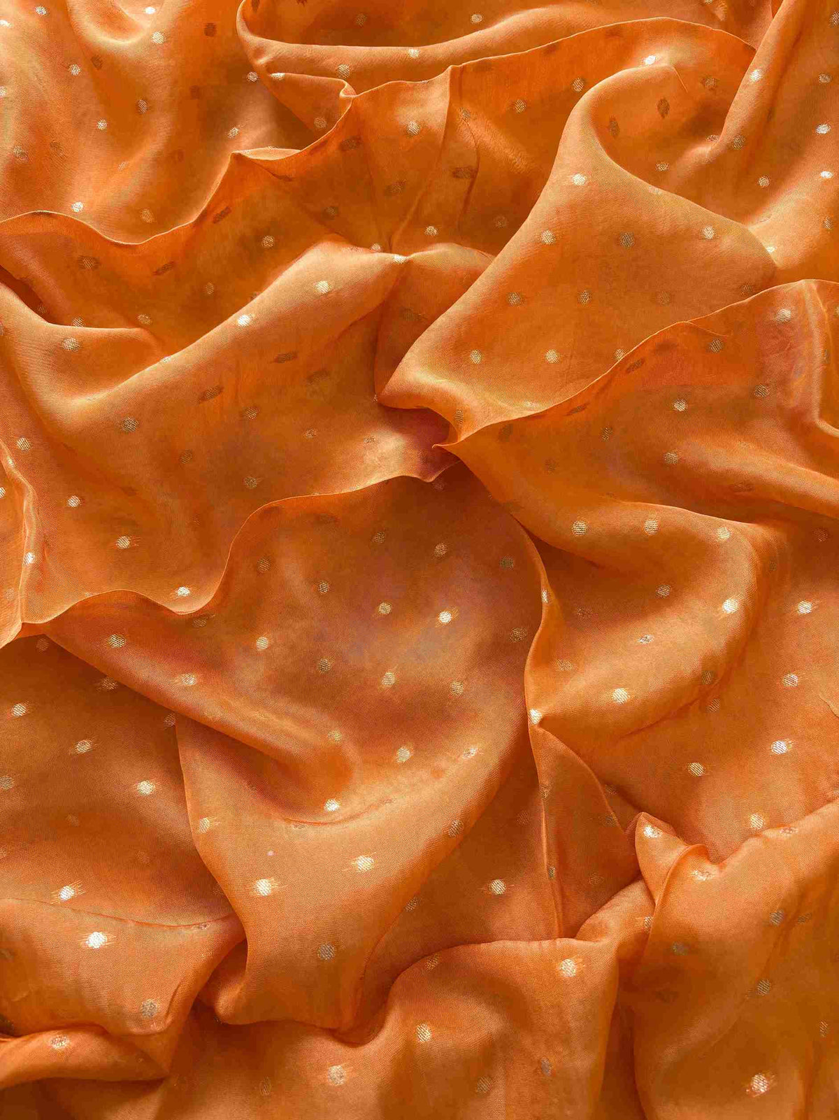 Shop the unstitched suit in brown and orange color on tissue shimmer fabric with Banarasi weaving all along the shirt and zardozi highlight on the neckline, giving it a very sophisticated look.