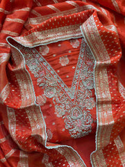 A bright orange with beautiful zardosi neckline in double V shape with sequence highlighting and zari floral motifs on whole shirt front and back.