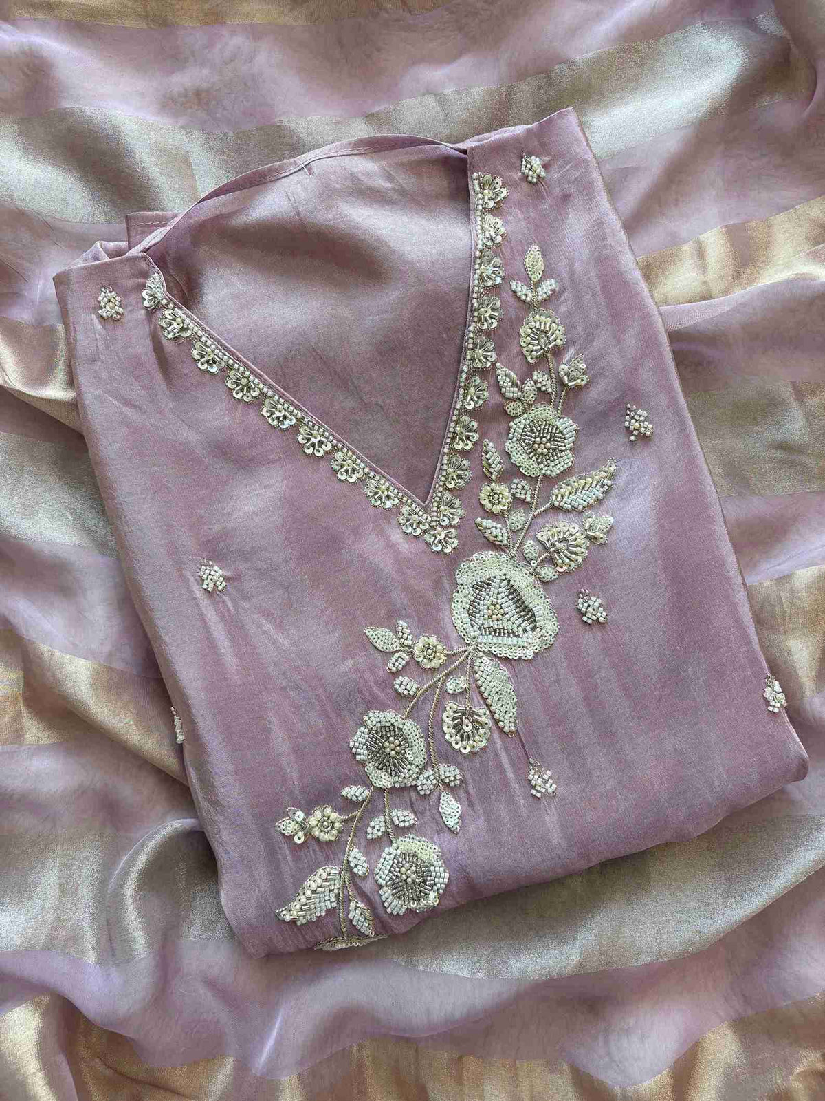 The outfit is an elegant suit set with intricate and delicate embroidery work.