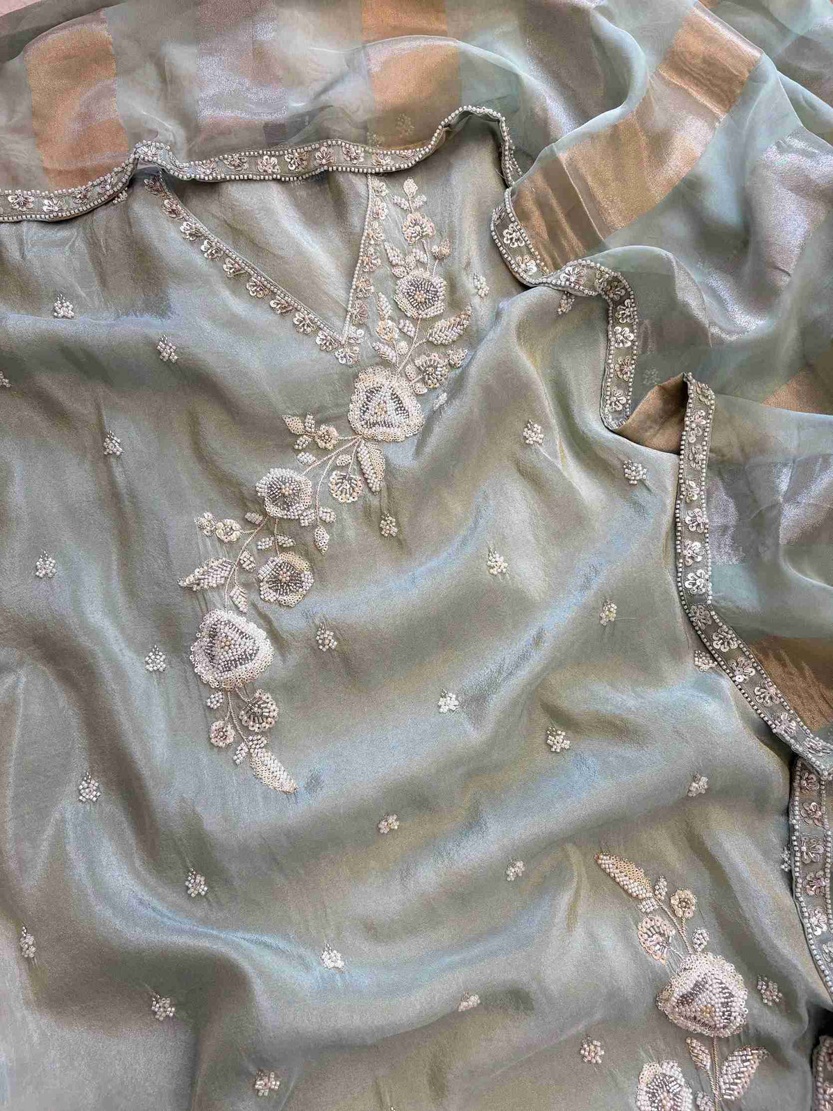 Beautiful hand embroidoried suit with intricate and delicate hand aari and beadwork, using silver and light gold tones.