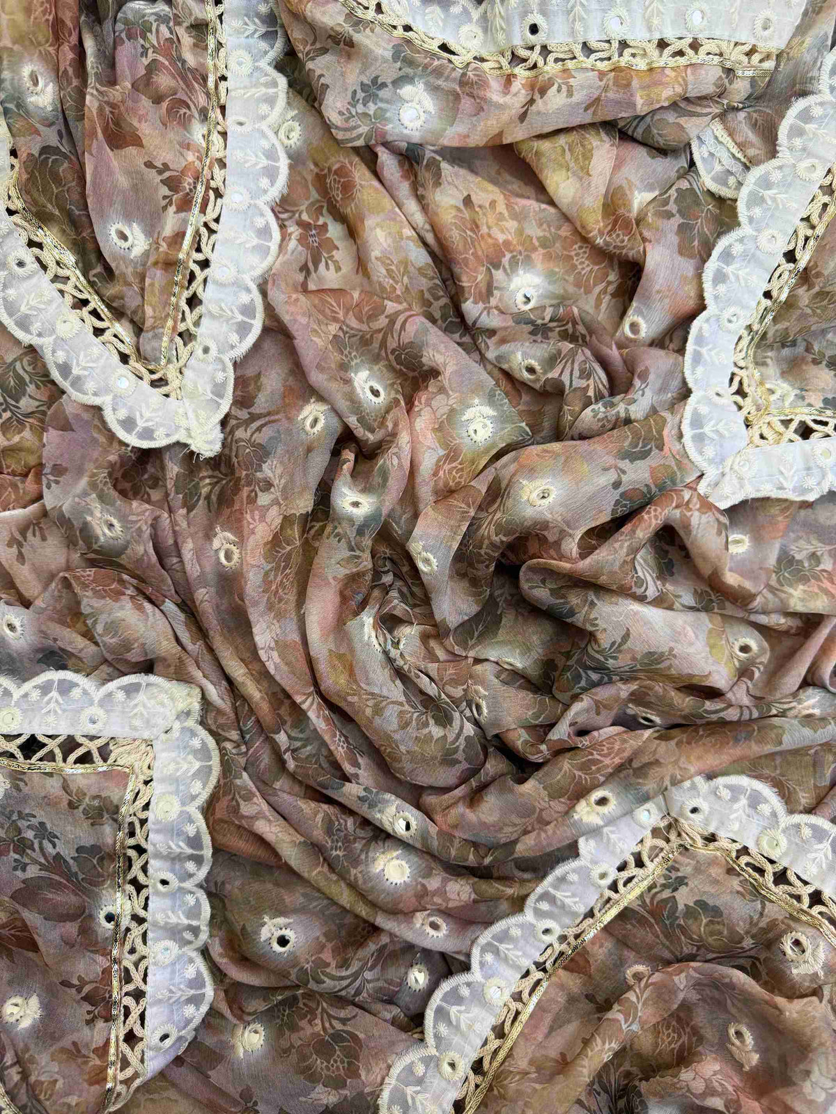 Step into timeless grace with this olive beige unstitched suit set, adorned with dainty white floral embroidery and scalloped lace detailing on the neckline. The kurta is finished with decorative pearl buttons and a charming tassel, giving it a handcrafted charm. Paired with a digitally printed organza dupatta in soft pastel hues and delicate lace edges, this set creates a poetic blend of vintage flair and modern elegance — perfect for understated festive moments or refined daywear.