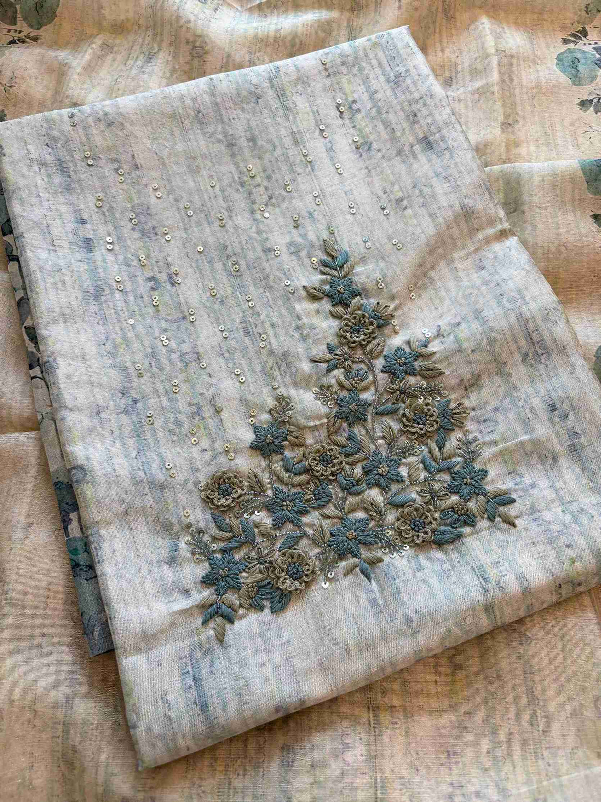 A Green-toned shirt with a delicately embroidered neckline, adorned with sequin and bead handwork forming graceful floral vines on the neck. The subtle shimmer of sequins enhances the rich textured base, making it ideal for elegant casual gatherings.