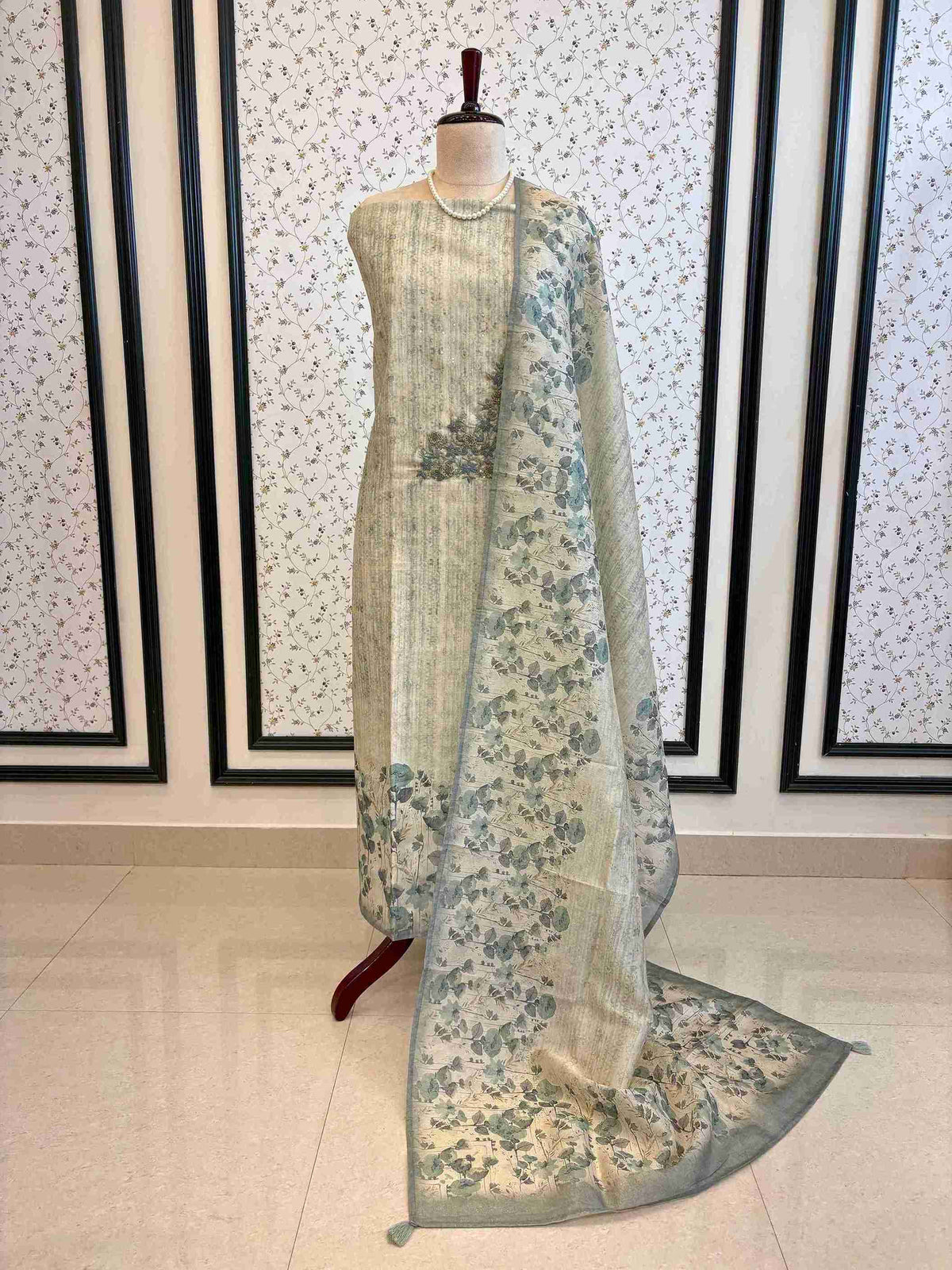 It is paired with an chanderi dupatta featuring a refined floral pattern with tassels, blending modern sophistication with traditional charm.