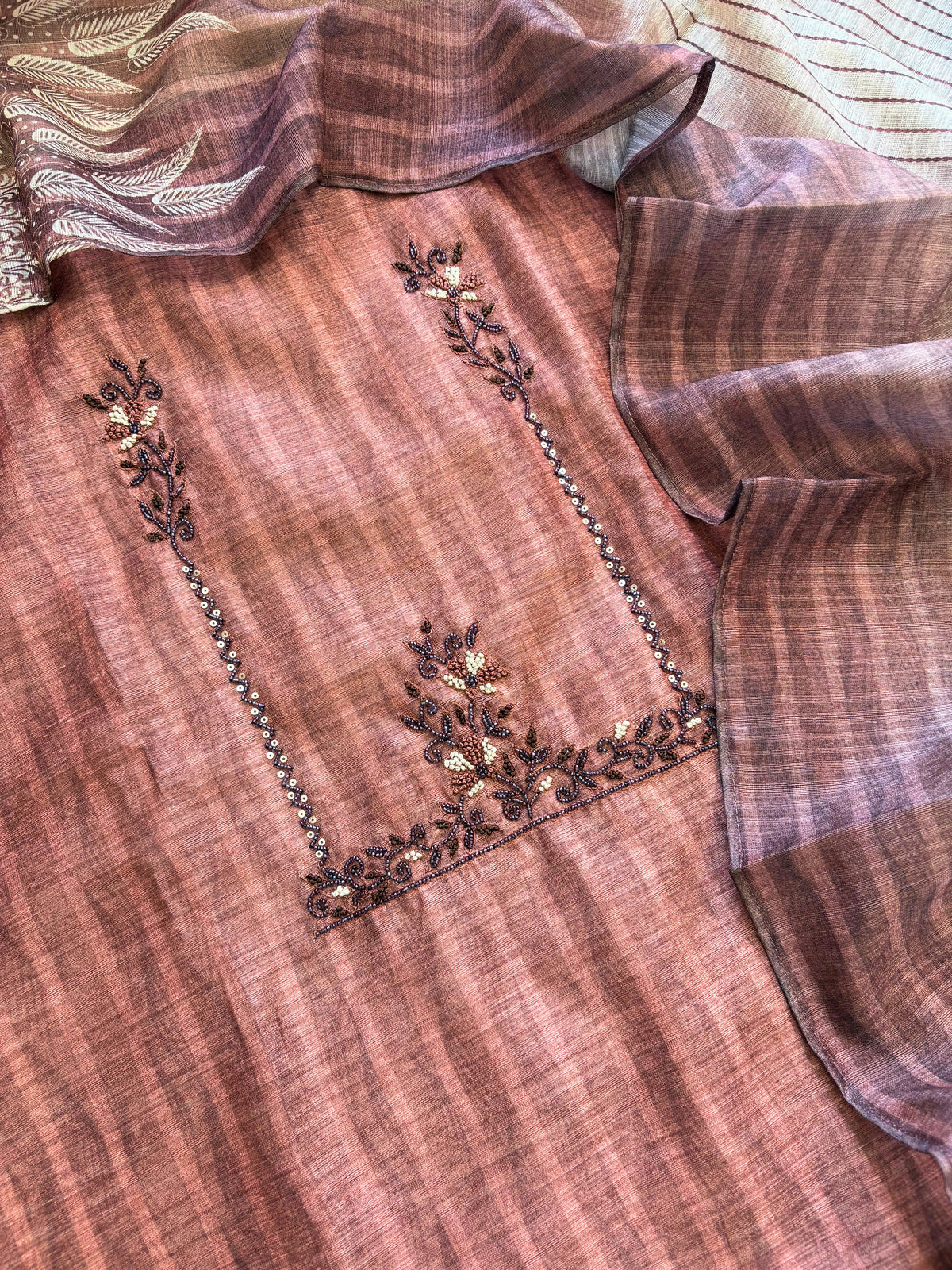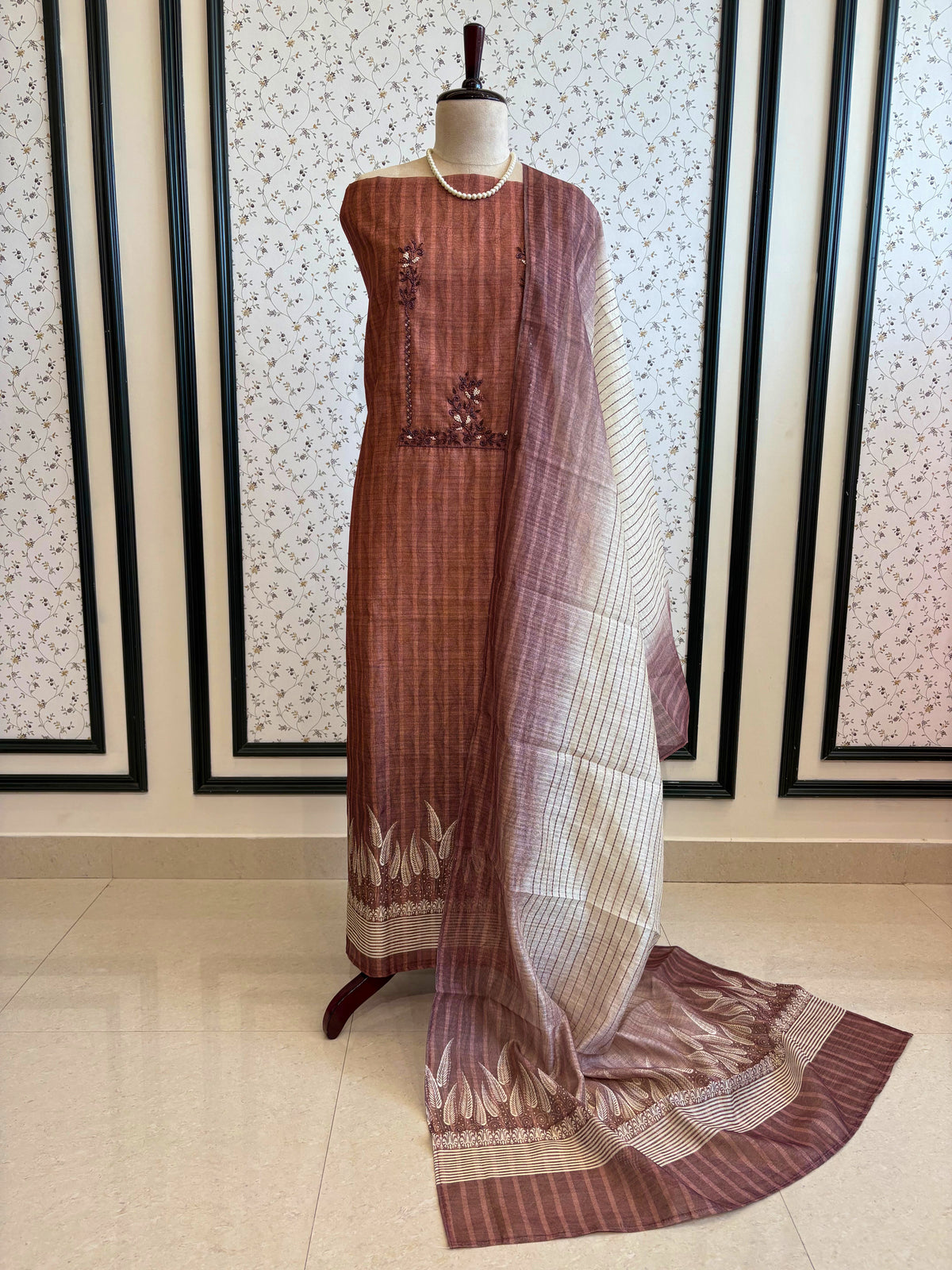 It is paired with an Tussar dupatta featuring refined leaf embroidery and woven stripes, blending modern sophistication with traditional charm.