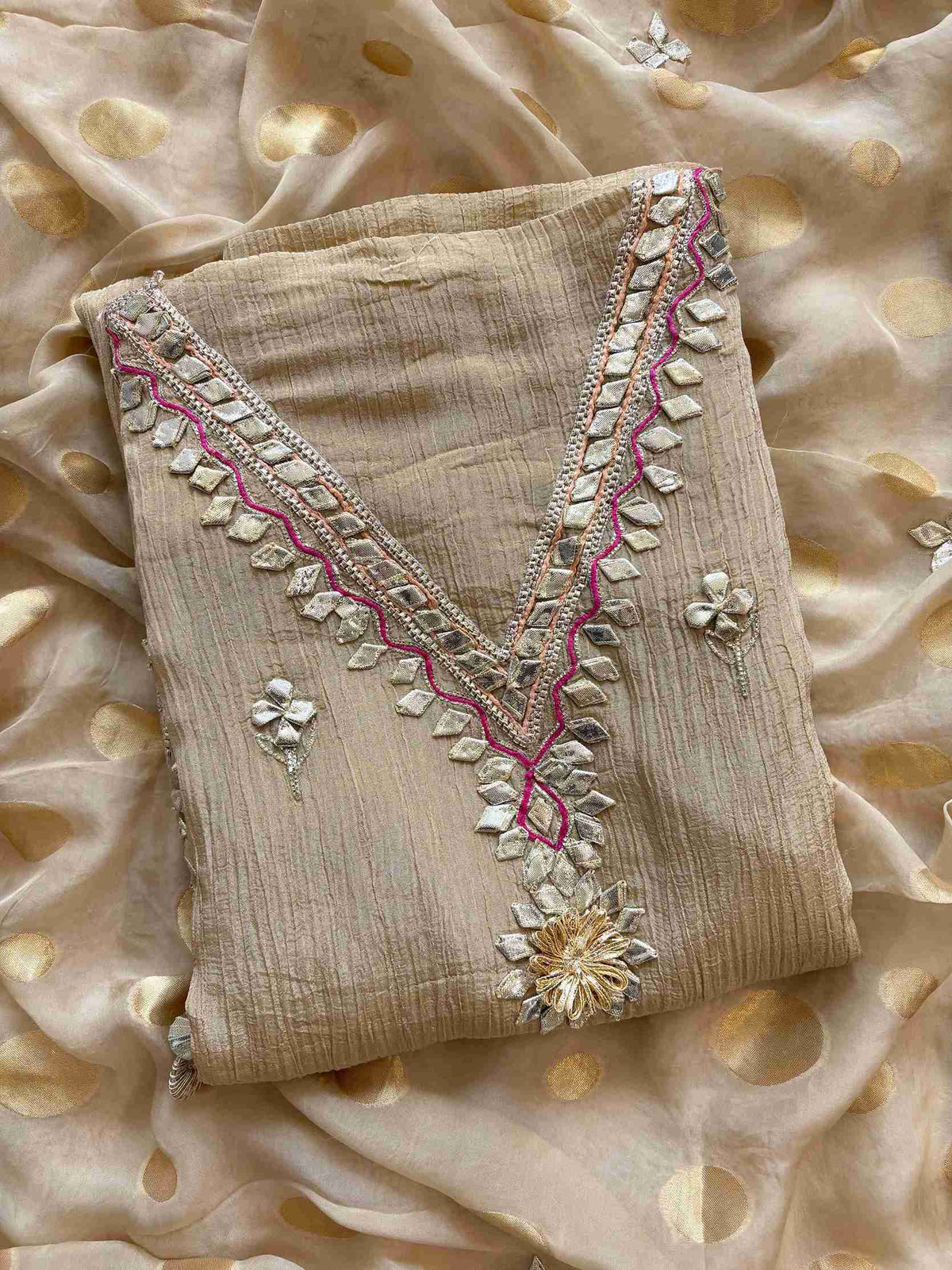 The shirt front is beautifully decorated with gota booties.