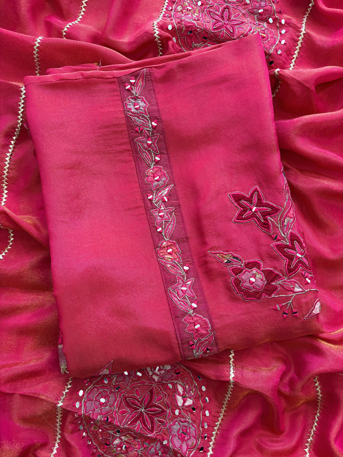 Turn heads with this striking magenta shimmer organza suit, adorned with delicate applique highlighting and subtle hand embellishments. The luminous fabric enhances the grandeur of the outfit, while the detailed dupatta with tassel finishing adds a festive charm.