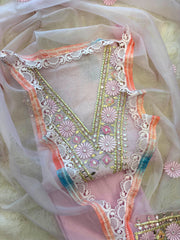 A soft pastel pink shirt with a delicately crafted V-shaped neckline embellished with mirror work, floral thread embroidery, and zari detailing — creating a subtle yet elegant festive charm. The intricate work across the neckline and motifs scattered all over add a touch of refined sophistication to this ethereal piece.