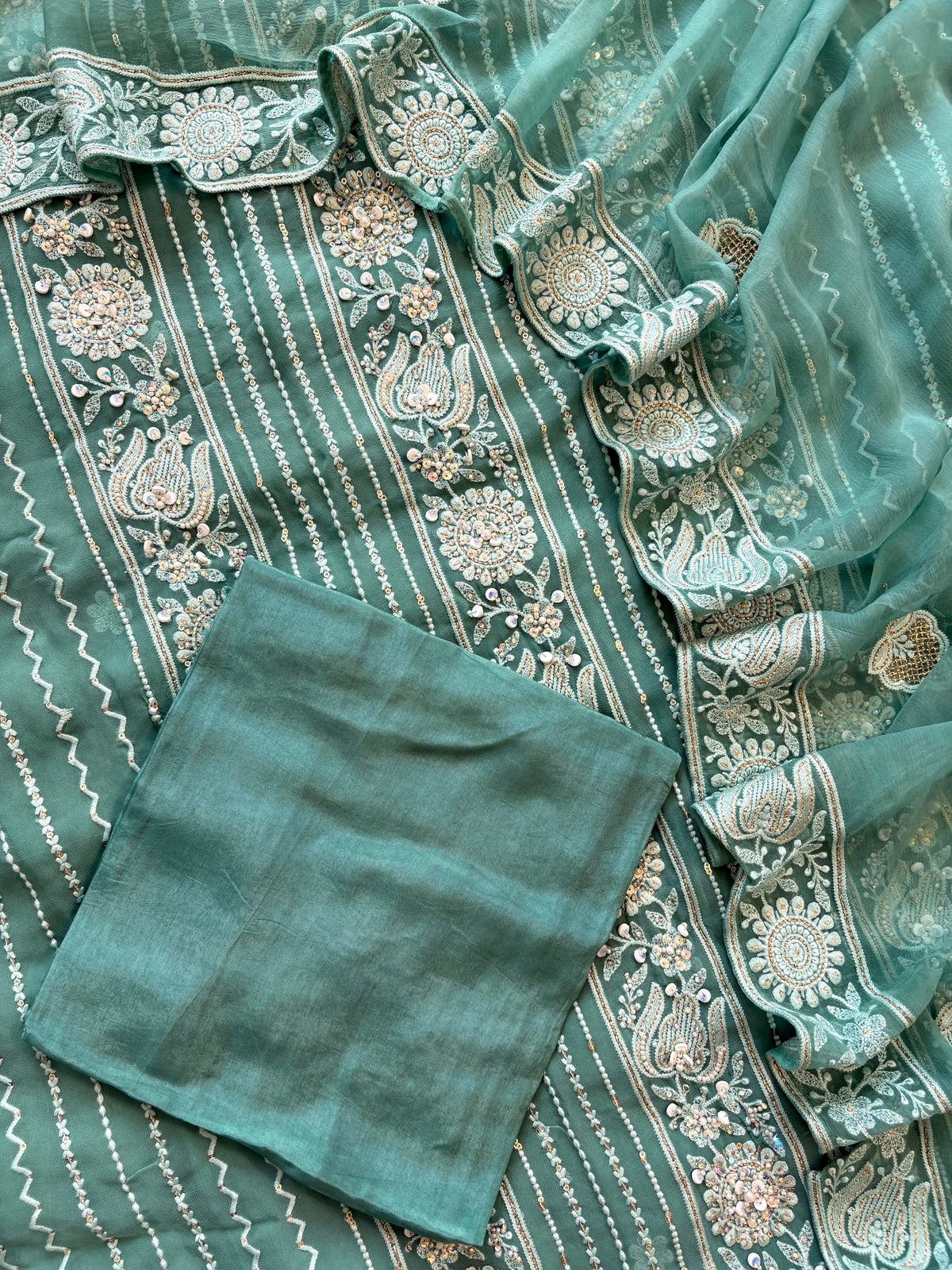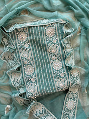 This elegant aqua green georgette chikankari suit is a perfect blend of timeless embroidery and modern embellishments. The intricate hand chikankari work is beautifully highlighted with sequins, pearls, stones, and zari thread embroidery, giving the outfit a regal touch. Paired with a matching embroidered dupatta, this suit is ideal for weddings, festive occasions, and traditional celebrations. The soft georgette base makes it comfortable while maintaining a graceful fall, making it a must-have for your ethnic wardrobe.