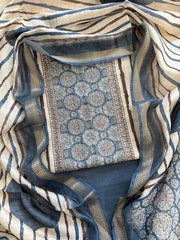 The dupatta is designed in matching Chanderi fabric and showcases coordinated contrasting stripes along with a beautifully highlighted Ajrakh printed border, creating a harmonious ethnic appeal. Completing the set is a plain cotton silk bottom in a complementary tone, chosen for comfort, structure, and easy tailoring. This ensemble is perfect for those who appreciate understated luxury with handcrafted detailing.