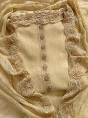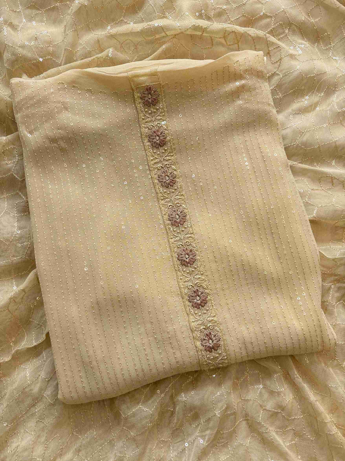 Step into understated luxury with this Beige Georgette Party Wear Unstitched Suit, crafted to bring elegance and effortless charm to every festive moment. The premium georgette shirt is adorned with sequins all over, creating a soft, graceful shimmer that glows beautifully in any light. A refined rose motif at the daaman, detailed using delicate thread work, adds a unique handcrafted touch, making this outfit stand out with quiet sophistication.