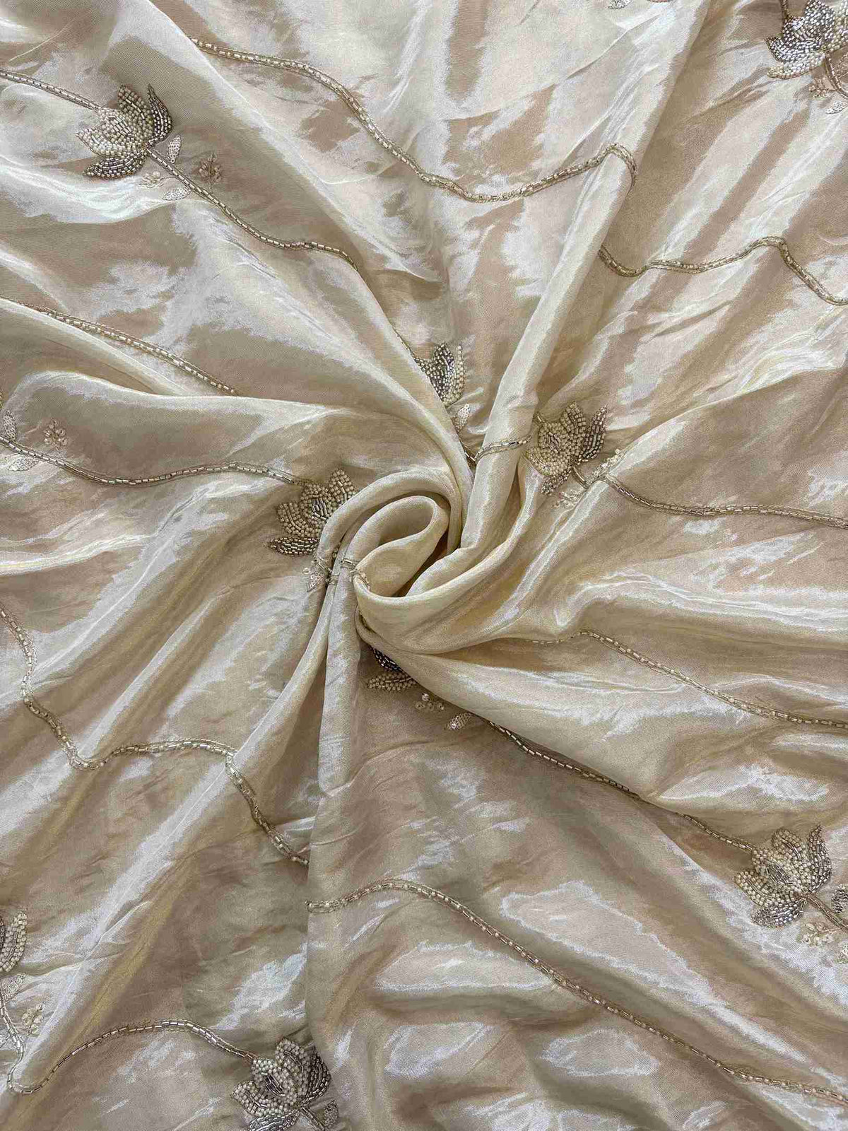 Diagonal lines of bead and sequin work running across the dupatta with flowers embellishment in between.