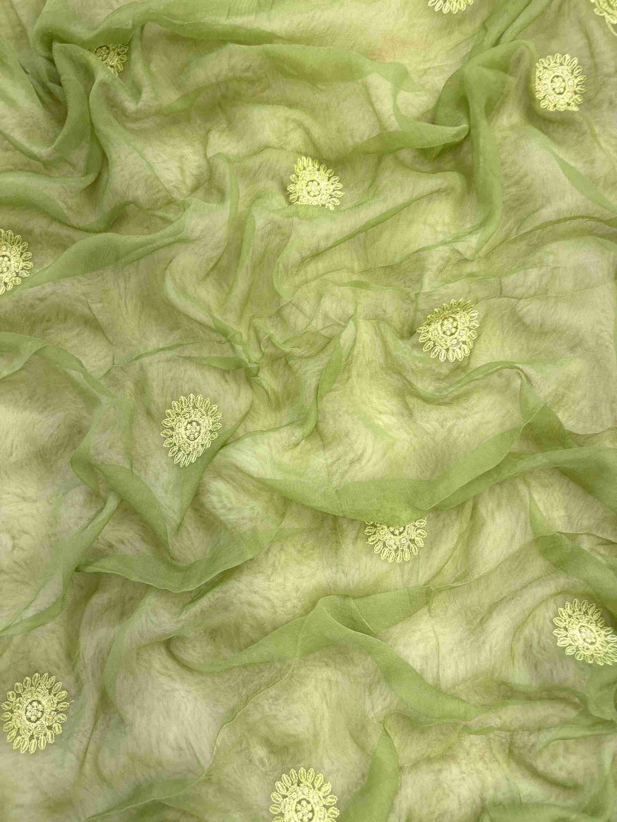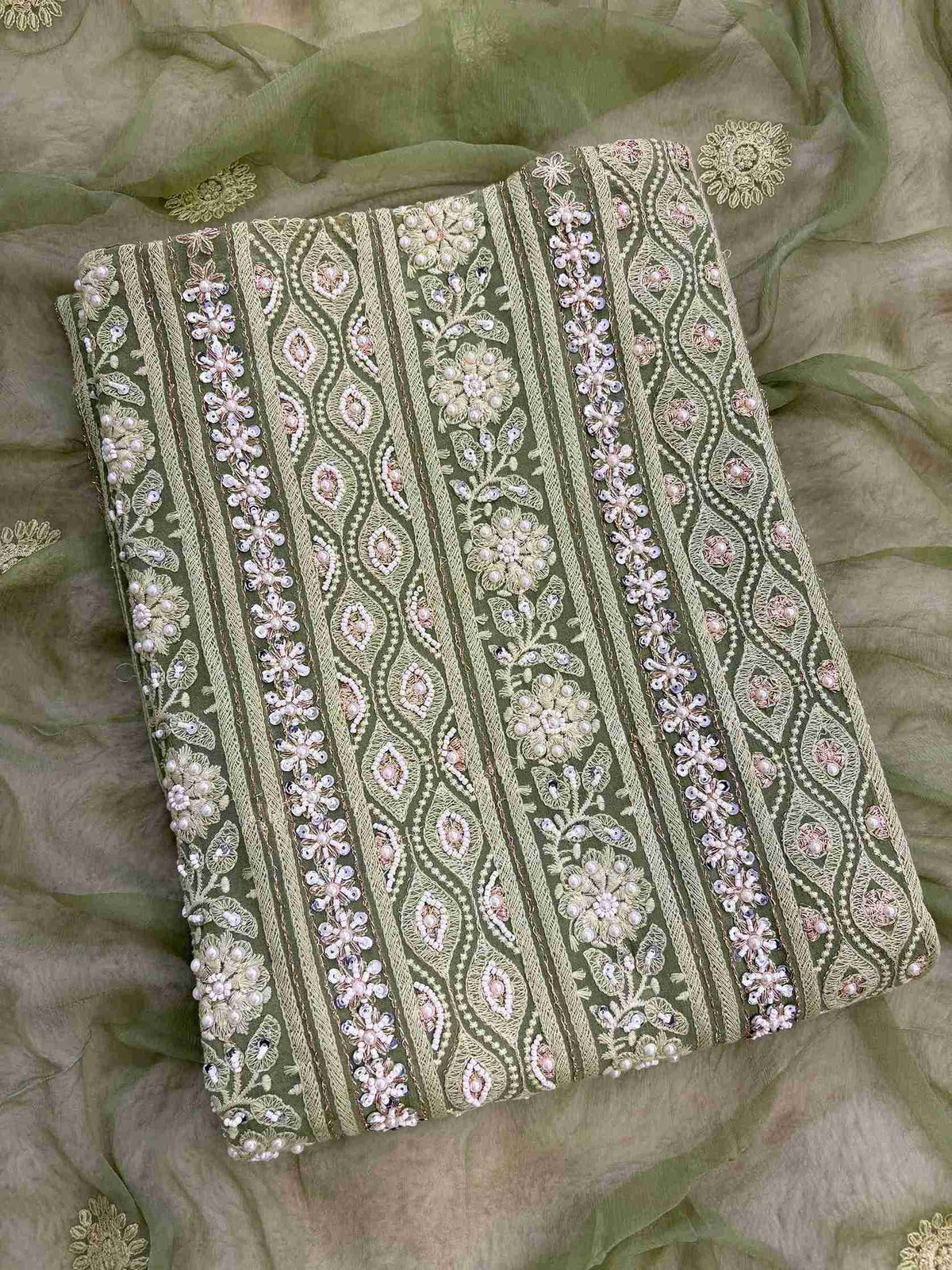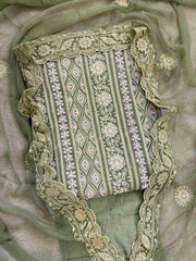 This mint green unstitched suit set is a graceful blend of traditional craftsmanship and festive elegance. The georgette shirt is adorned with heavy chikankari embroidery, enhanced with delicate sequin work and subtle mirror embellishments that add a refined shimmer. Paired with a matching chiffon dupatta featuring tonal thread embroidery and scattered motifs, this ensemble creates a soft yet luxurious statement, perfect for special occasions.