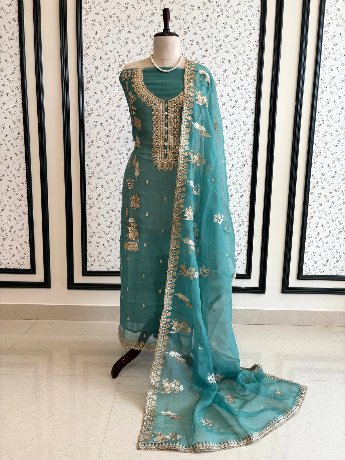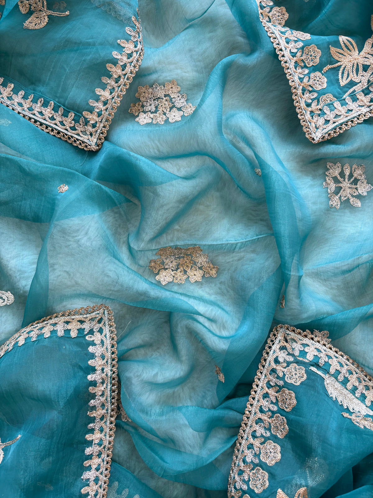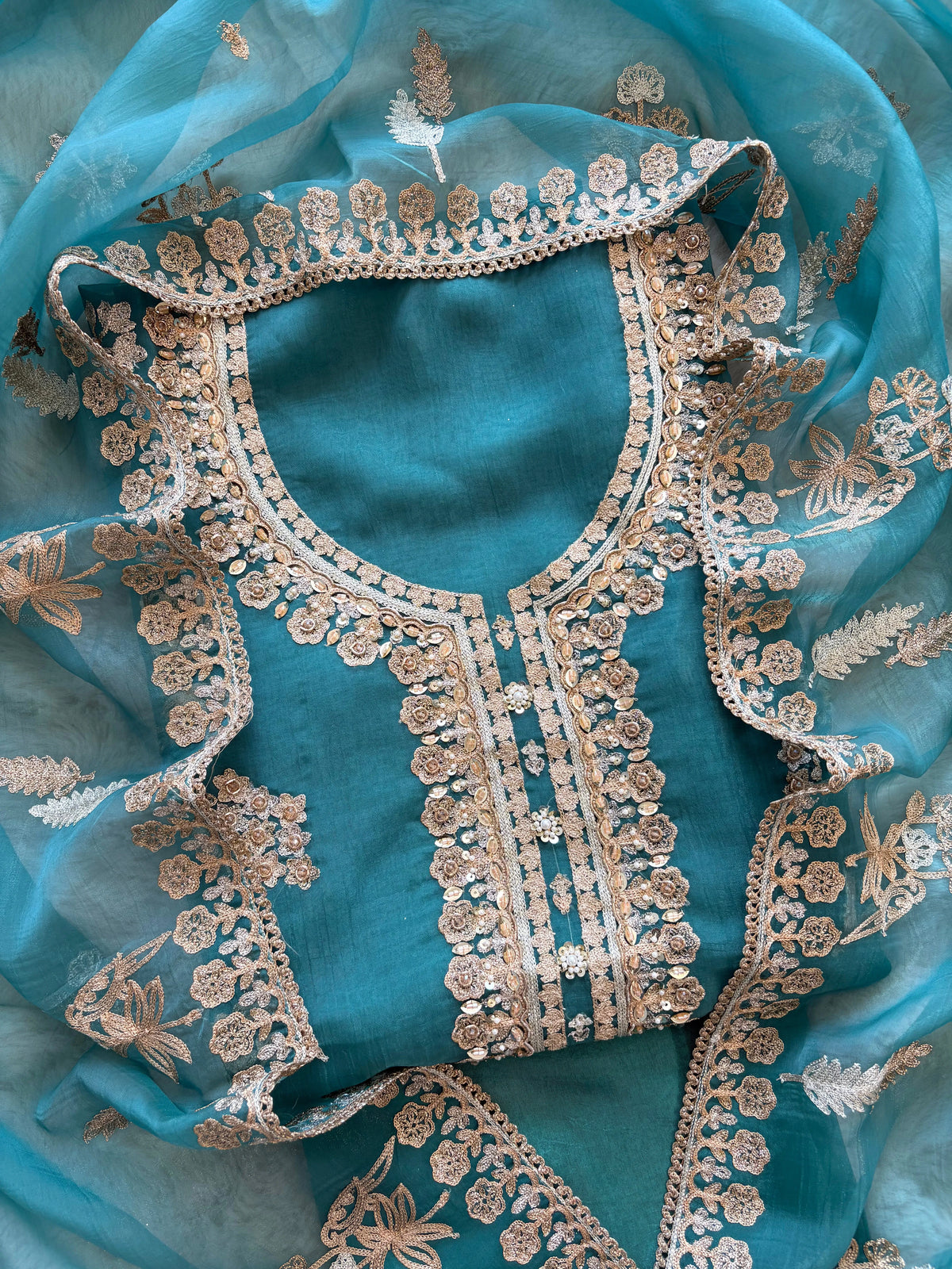 Step into timeless elegance with Noor-e-Zareen, a luxurious glass tissue suit in soft teal. The shimmering fabric is adorned with intricate zari embroidery on the kurta and dupatta, adding a regal charm. Finished with a beautifully embellished neckline and zari-bordered dupatta, this ensemble perfectly blends sophistication with festive glamour.