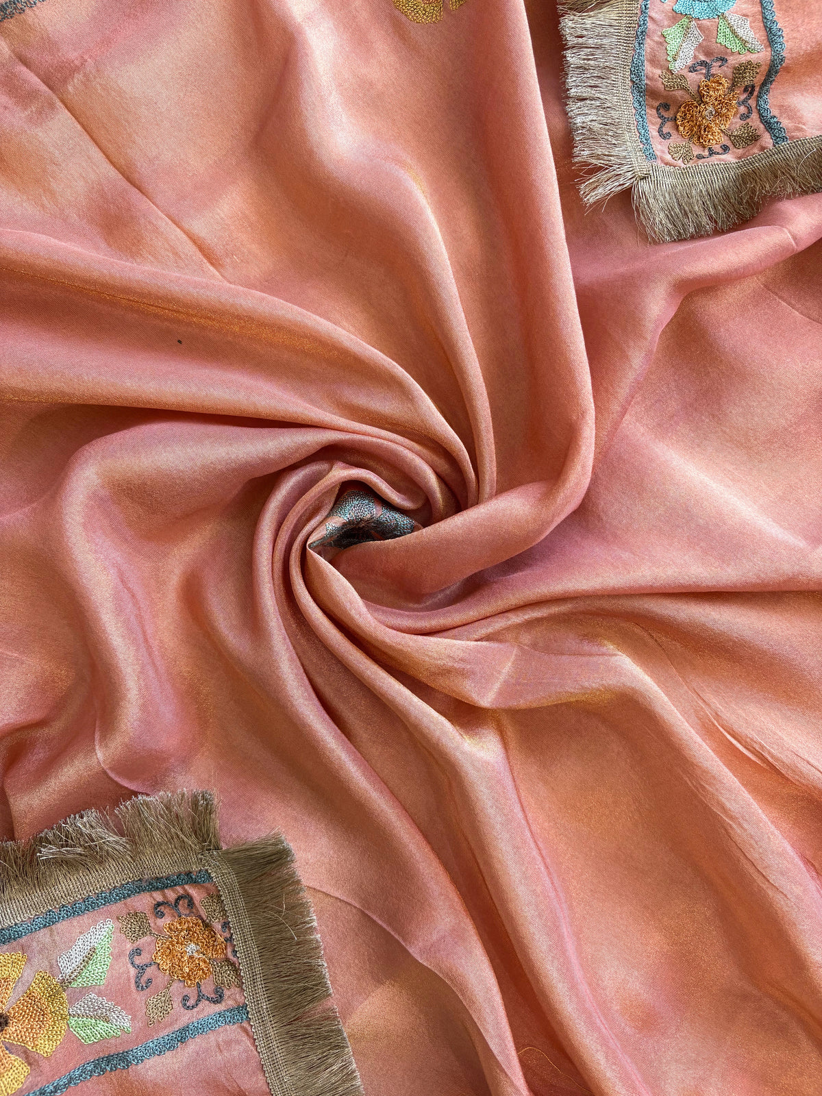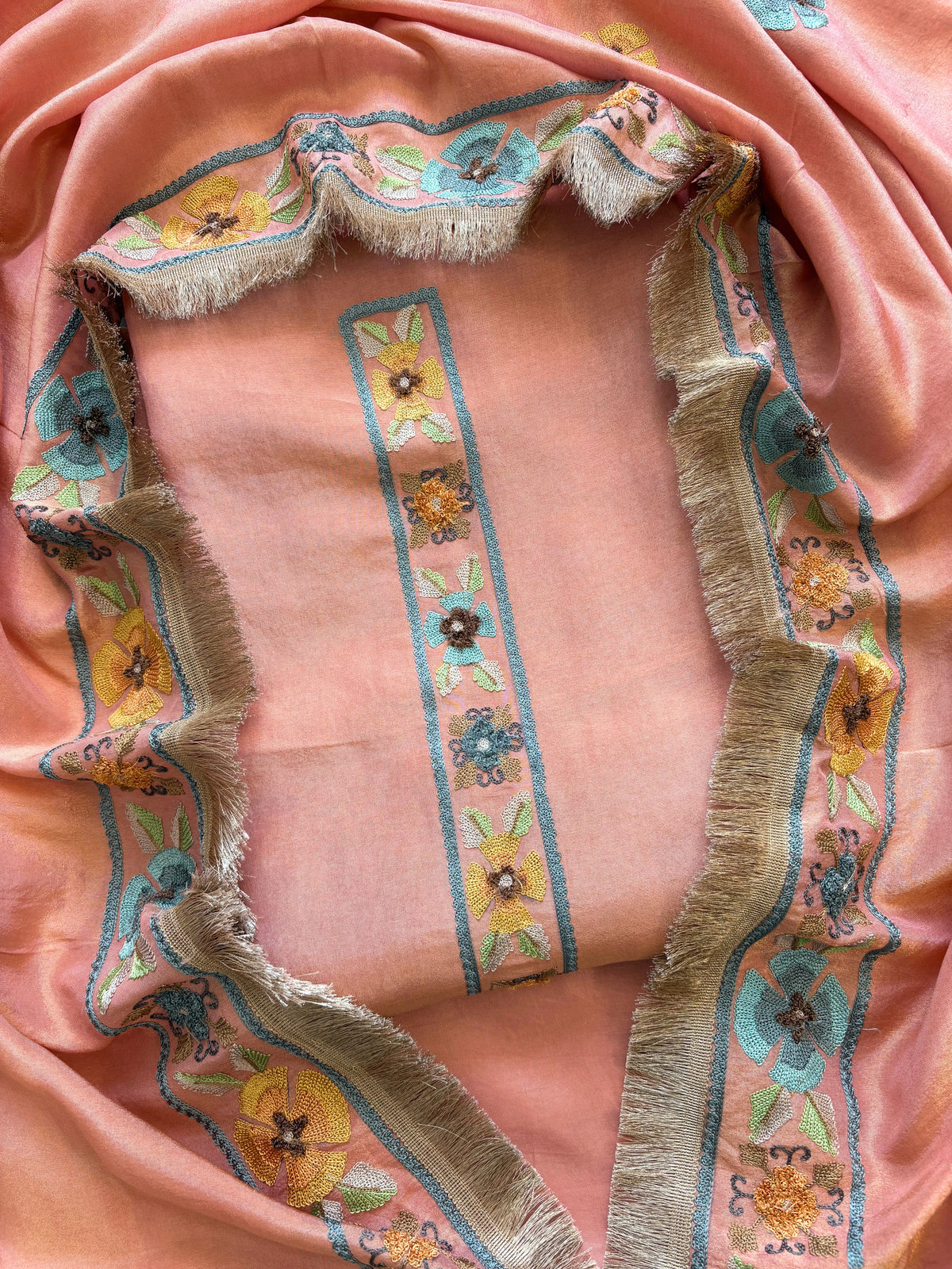 Bask in timeless elegance with this peach-hued unstitched shimmer organza suit, featuring exquisite Kashida embroidery and radiant kiran lace highlights. The kurta is adorned with artistic floral threadwork in jewel tones, set against a soft shimmer base that lends a luxe glow. Its straight-cut silhouette is perfectly complemented by a richly bordered dupatta with intricate Kashida motifs and gold fringe detailing, adding traditional charm with a contemporary edge. A graceful choice for daytime weddings, festive occasions, or refined soirées.