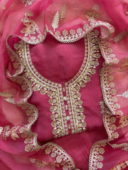 Step into timeless elegance with Noor-e-Zareen, a luxurious glass tissue suit in soft pink. The shimmering fabric is adorned with intricate zari embroidery on the kurta and dupatta, adding a regal charm. Finished with a beautifully embellished neckline and zari-bordered dupatta, this ensemble perfectly blends sophistication with festive glamour.