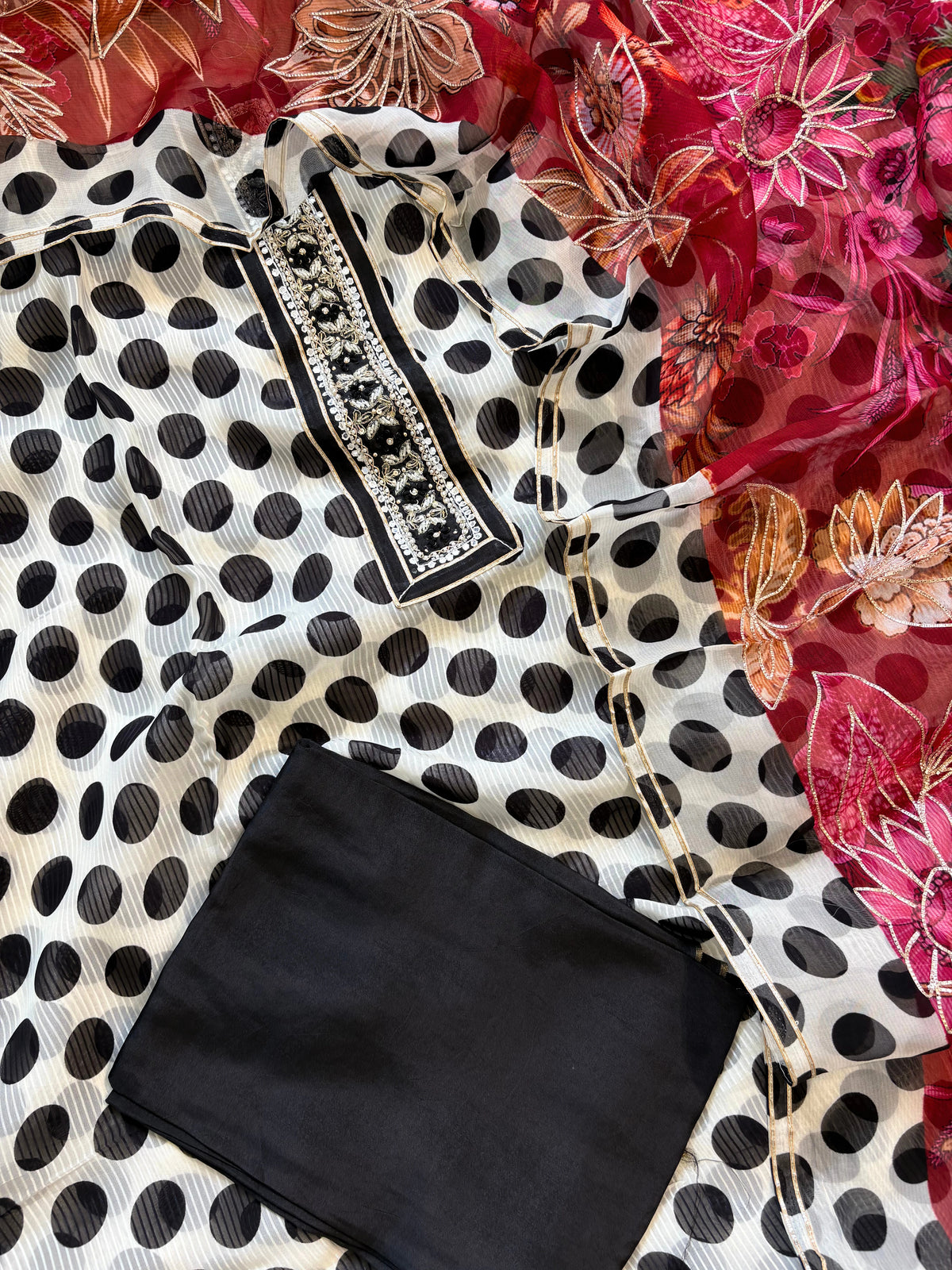 Hey Ladies, Shop your all-time favorite organza suit with a polka dot print, giving it a classy yet modern look. The suit is a perfect blend of all-time favorites: red, black, and white.