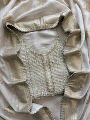 Shop your favorite organza unstitched suit in beige color with heavy neck embellishments of pearls, sequins, and zardozi, the same continued on the daaman also.