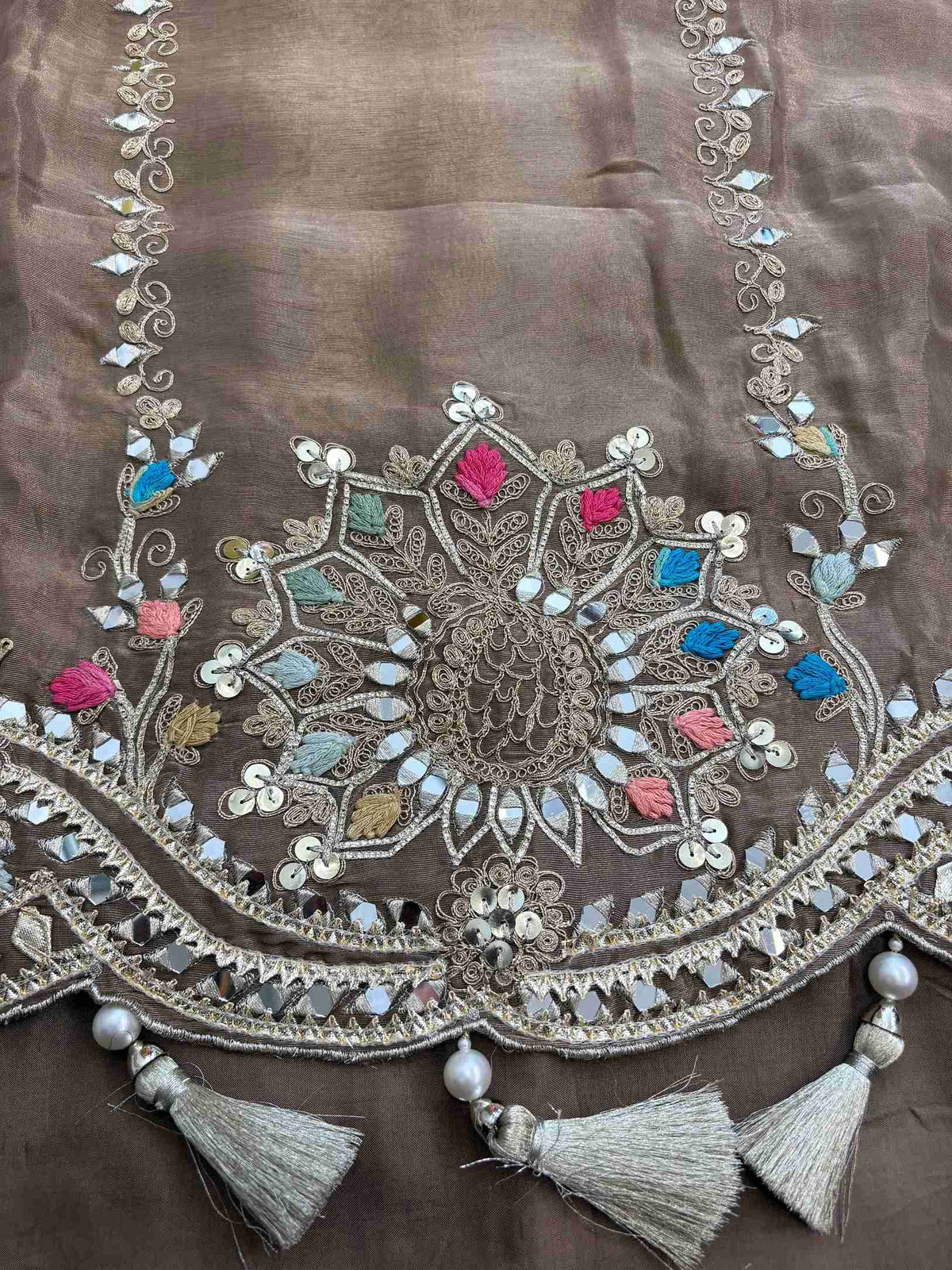 Shimmer tissue unstitched suits with beautiful original mirror work & dori work used. The daaman is beautifully embroidered with resham thread, sequins, and mirrors and gota lace highlighting and latkans.