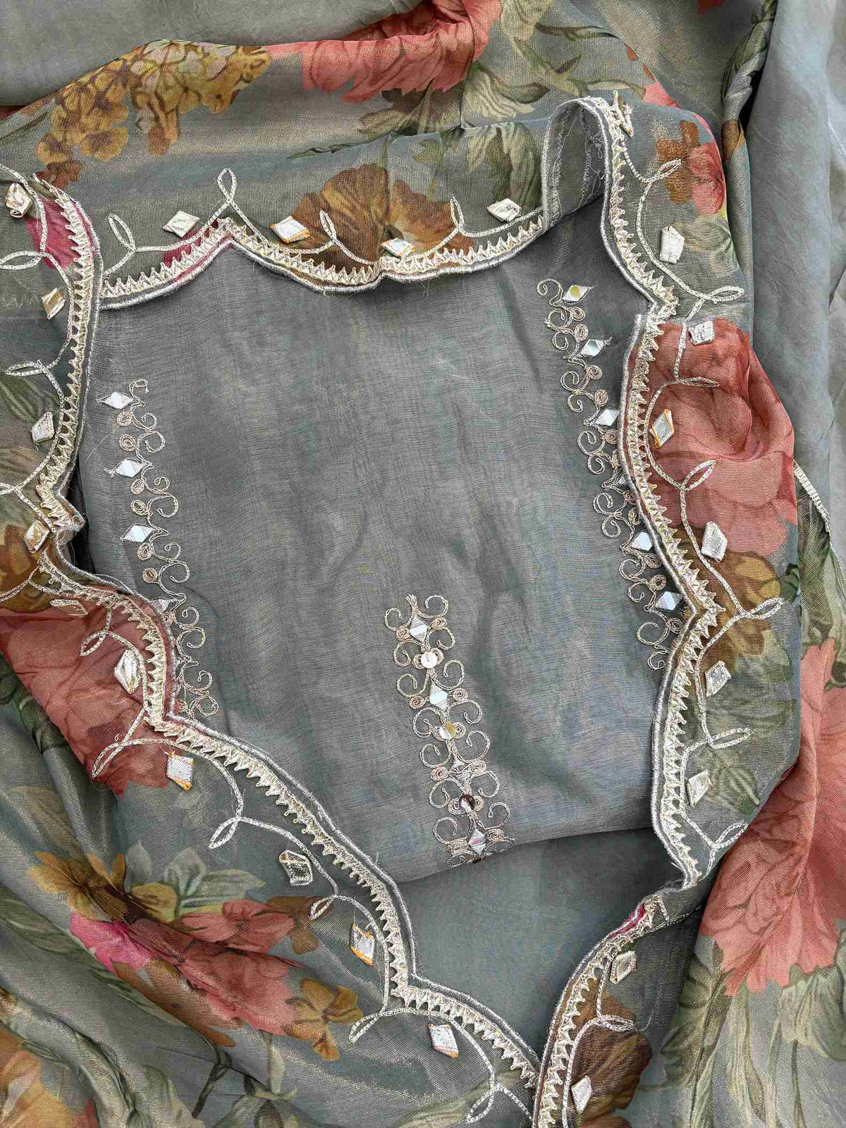 Shimmer tissue unstitched suits with beautiful original mirror work & dori work used. The daaman is beautifully embroidered with resham thread, sequins, and mirrors and gota lace highlighting and latkans.