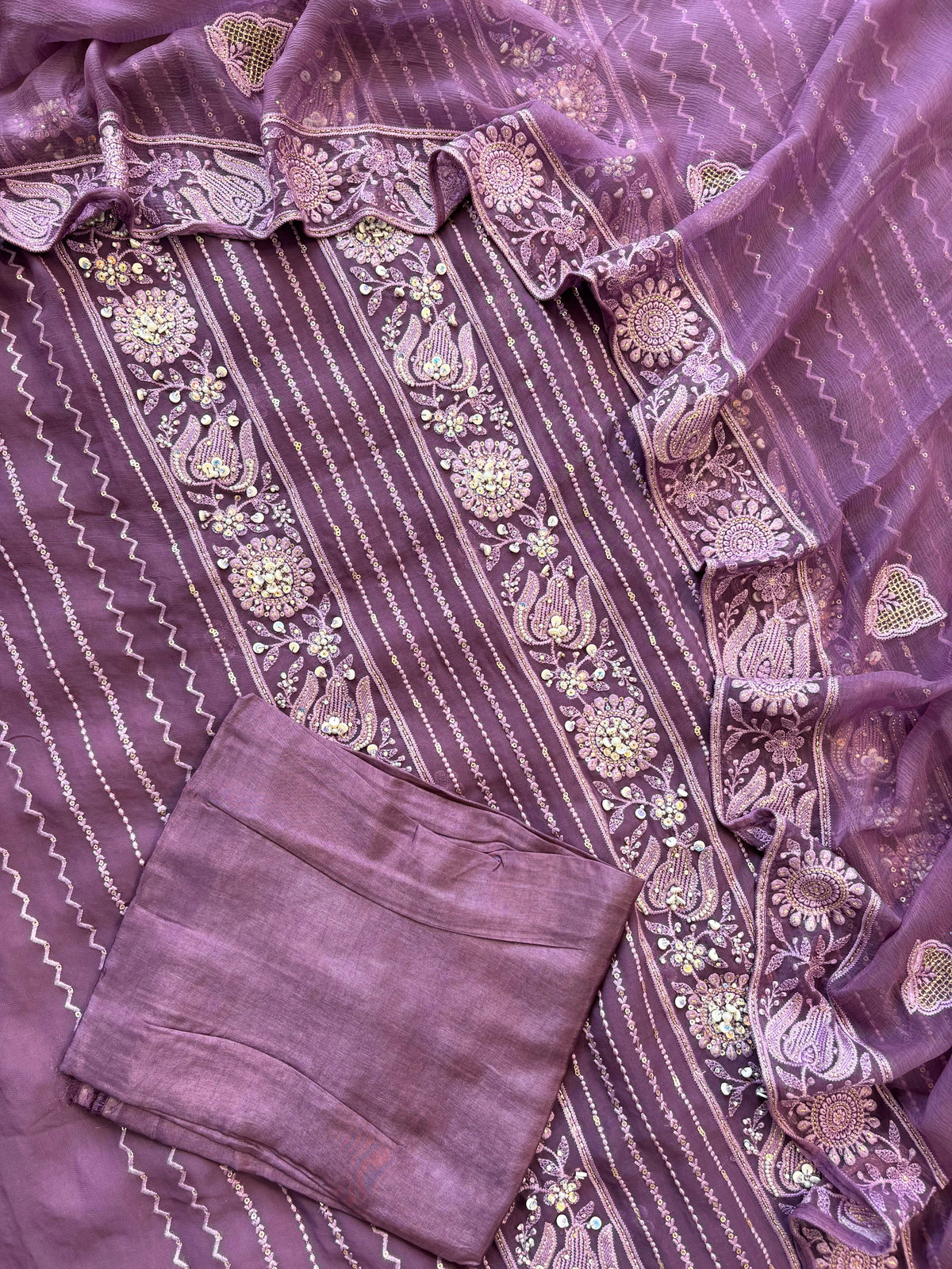 This elegant purple georgette chikankari suit is a perfect blend of timeless embroidery and modern embellishments. The intricate hand chikankari work is beautifully highlighted with sequins, pearls, stones, and zari thread embroidery, giving the outfit a regal touch. Paired with a matching embroidered dupatta, this suit is ideal for weddings, festive occasions, and traditional celebrations. The soft georgette base makes it comfortable while maintaining a graceful fall, making it a must-have for your ethnic wardrobe.
