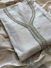 Organza full size zari flower wines work dupatta with four sides kiran lace border and golden and beige colored stripes.