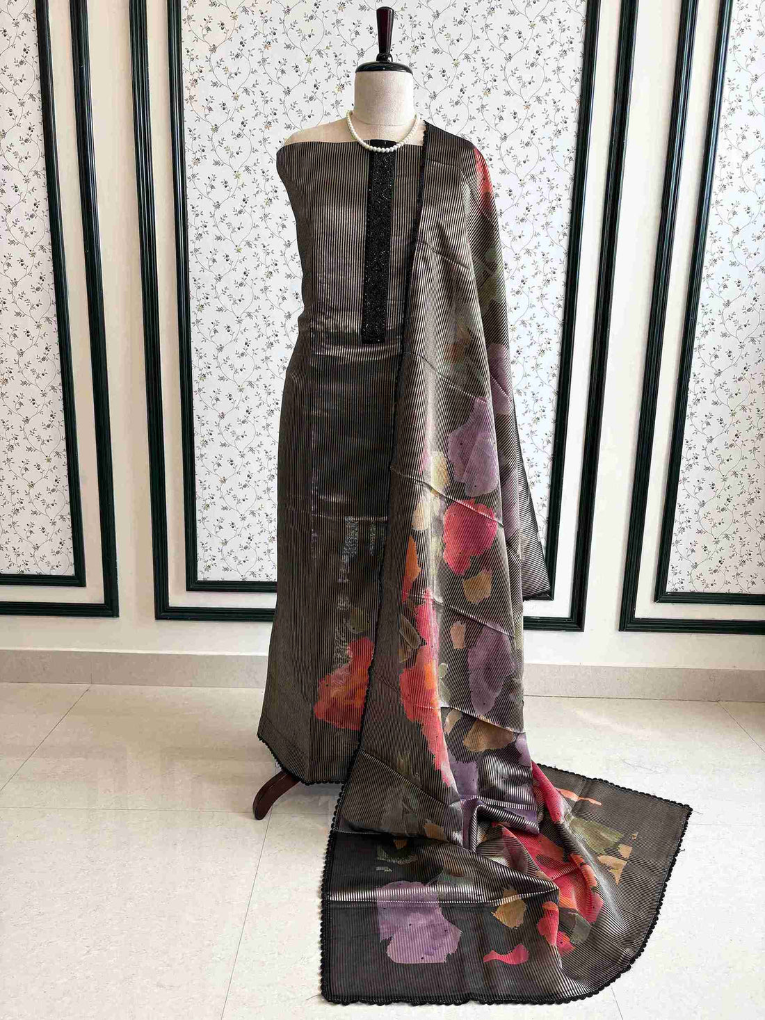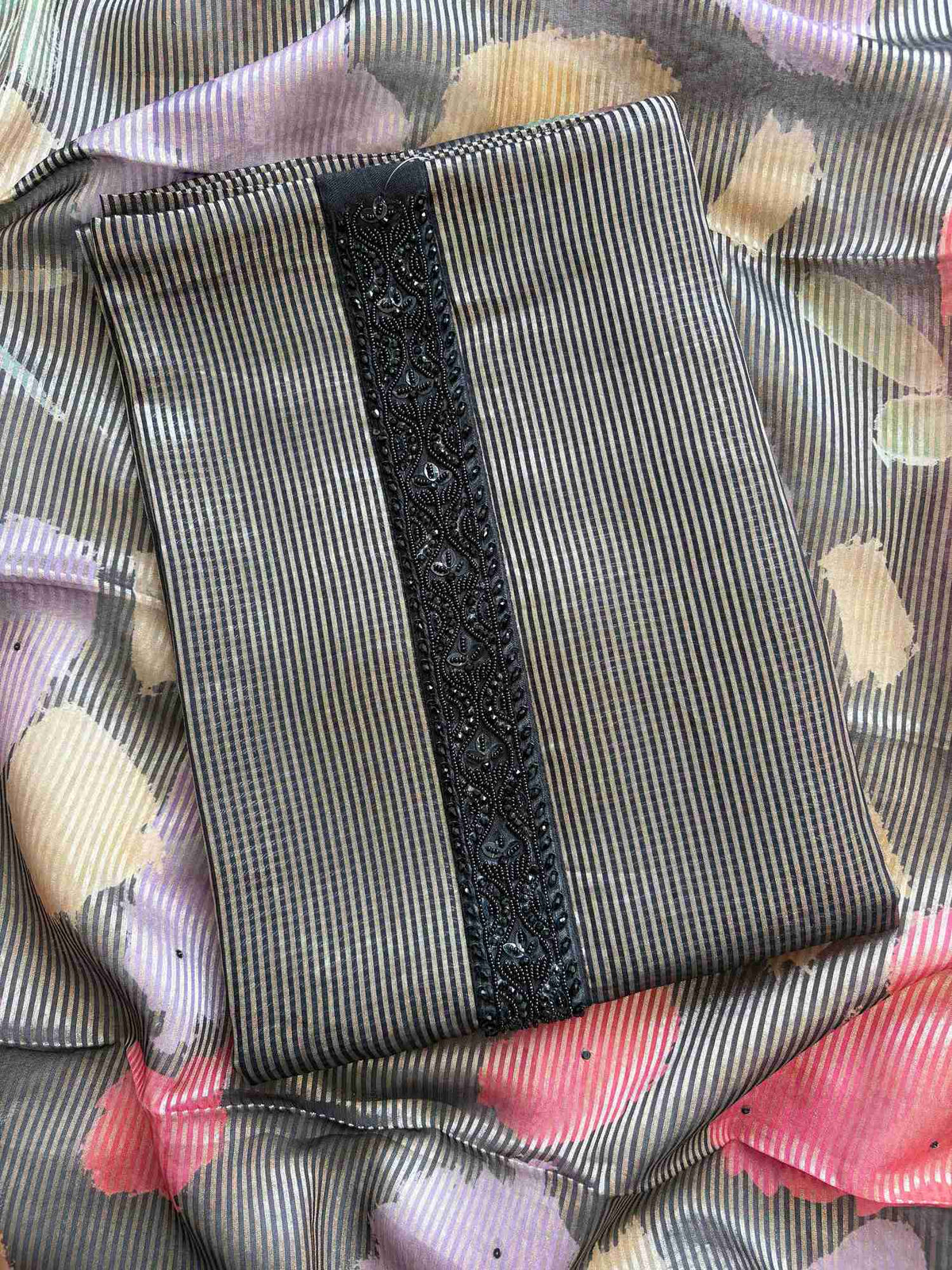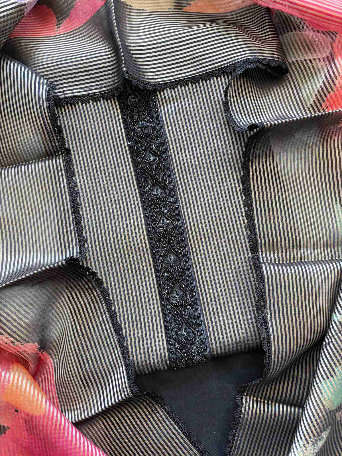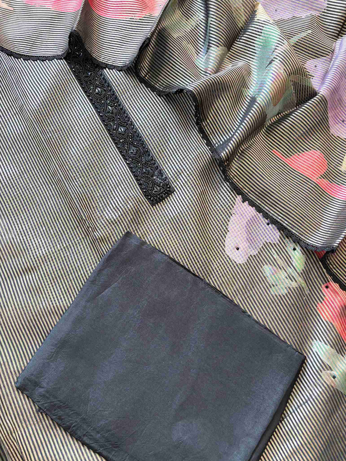 Flowy organza Unstitched suit with neck Patti design and golden and black thin stripes on fron and back of shirt