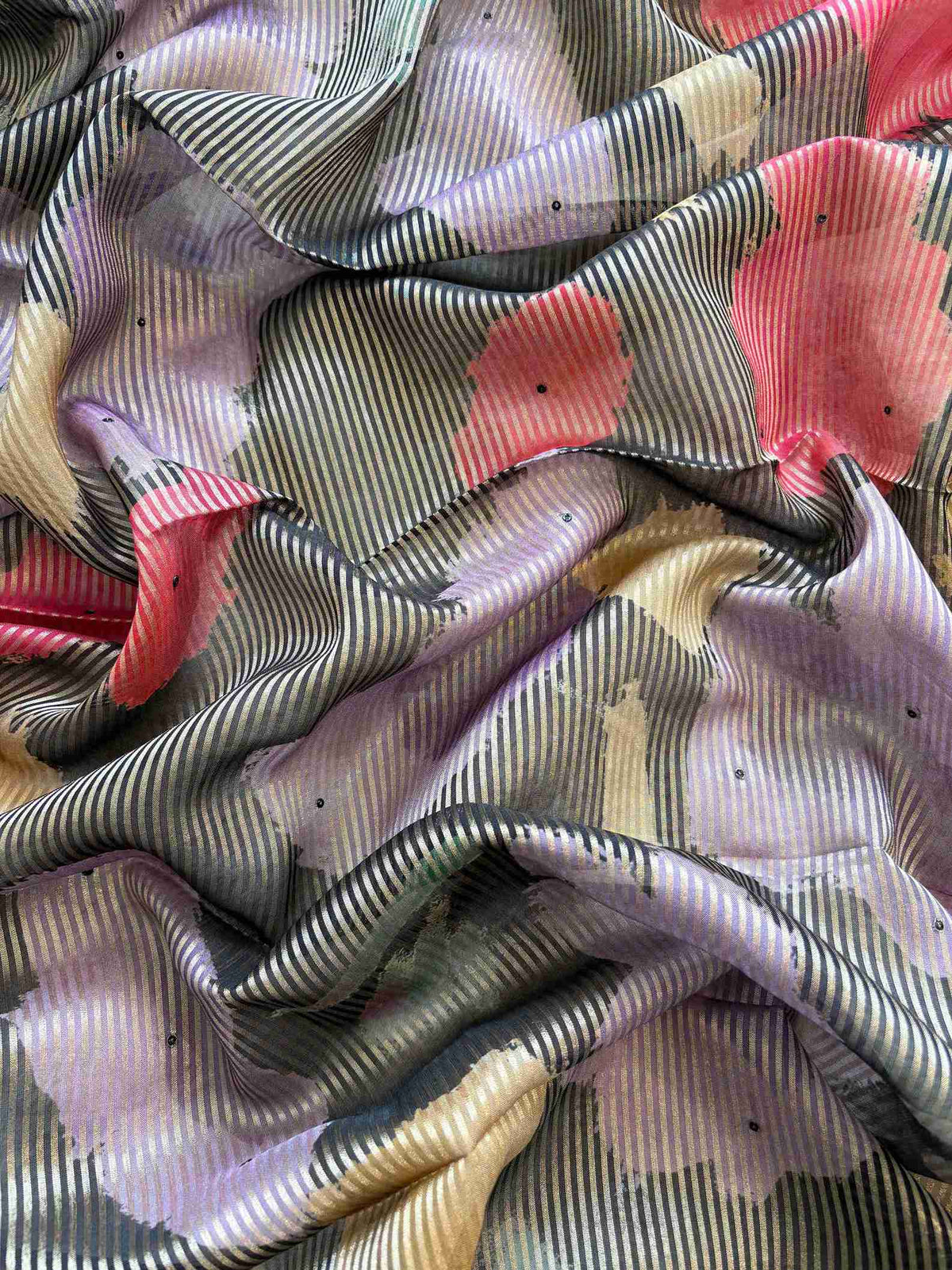 Flowy organza full size dupatta with flowers digital print done on the two longer sides with black and golden stripes same as shirt.